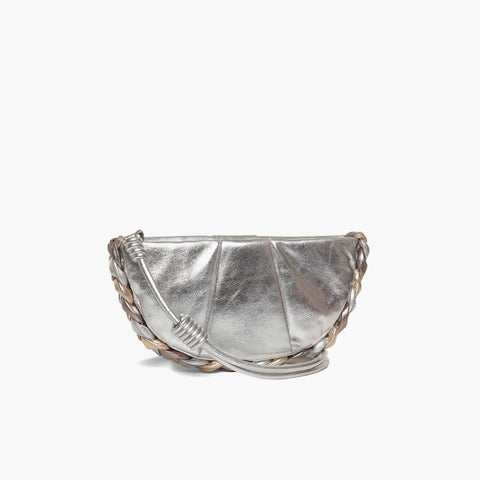 Clutch de tamanho pequeno, também pode ser usada como bolsa de ombro ou tiracolo. Possui alça trançada fixa e reversível, e acompanha alça removível e ajustável. Seu compartimento interno único é forrada em tecido listrado, e possui bolso de couro com logo.