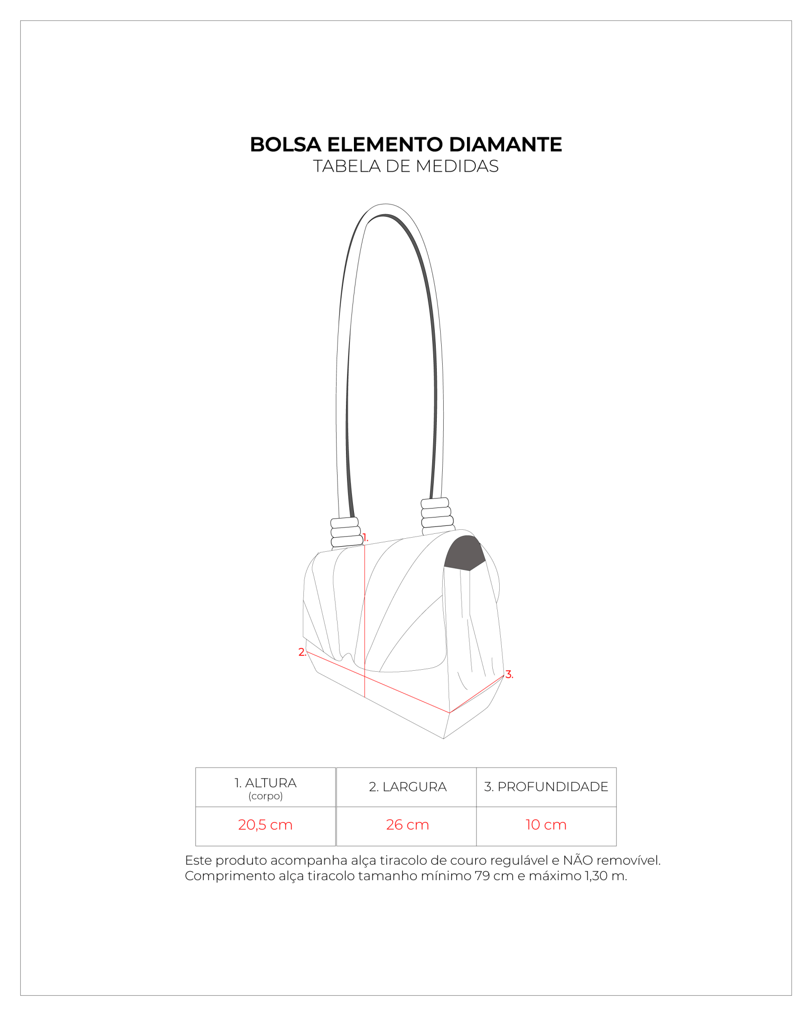 Uma bolsa tiracolo em couro com alça ajustável. Essa peça é perfeita para te acompanhar em todos os momentos e dar um toque de sofisticação em qualquer look. O interno vem com uma divisão pensada para você separar os itens de mais necessidades dos itens que precisam de um zelo a mais. Um dos compartimentos vem com dois bolsos internos e um porta batom, o outro compartimento vem com um bolso interno, ambos com acabamento em couro na cor da bolsa para dar um ar ainda mais chic para a bolsa. Para a coleção Diamante, a tampa vem com um trabalho sofisticado para dar mais realce ao couro metalizado. Feita em couro legítimo e com interno em suéde.