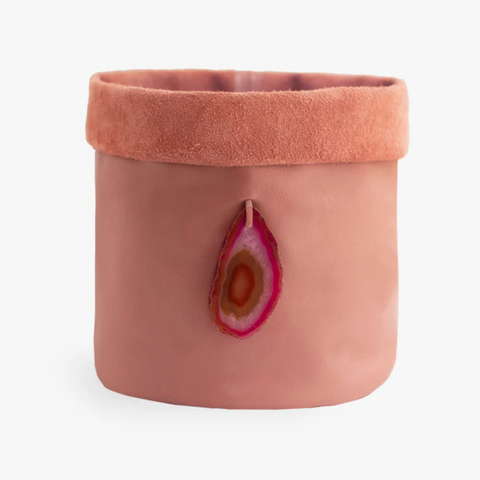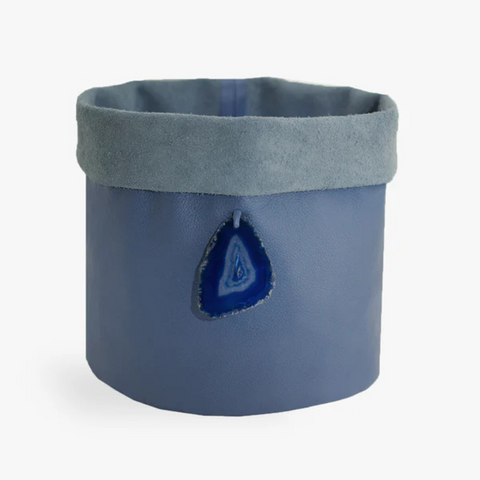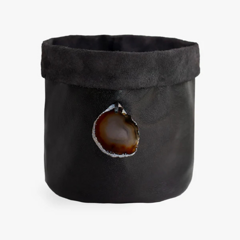 Cachepot de couro com pedra natural, a ideia é combinar cada cor com uma pedra em ton-sur-ton e dar ainda mais charme e significado para a peça. O tamanho G é ideal para você usar em vasos maiores. A utilização pode ser diversificada, dependendo da sua criatividade para combinar com itens da sua casa e escritório. O cachepot de couro branco vem combinando com a chapa de ágata marrom que é a pedra da plenitude.