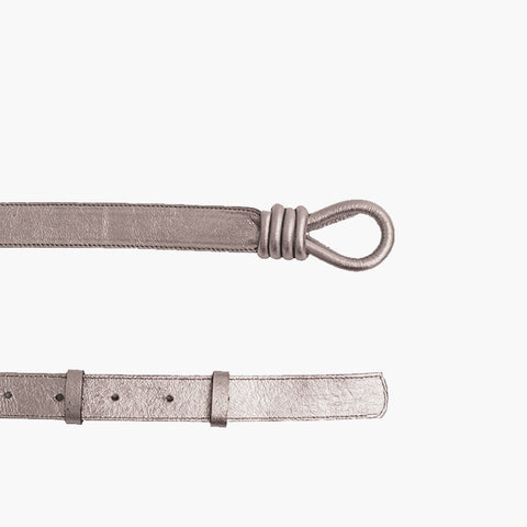 Cinto feminino de couro metalizado com alça e fechamento por encaixe com carrapeta ônix.