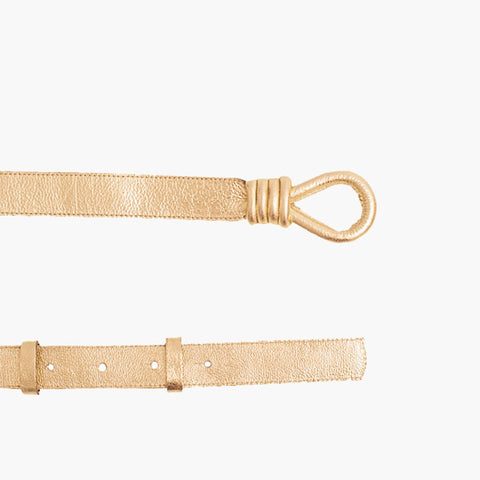 Cinto feminino de couro metalizado com alça e fechamento por encaixe com carrapeta ônix.