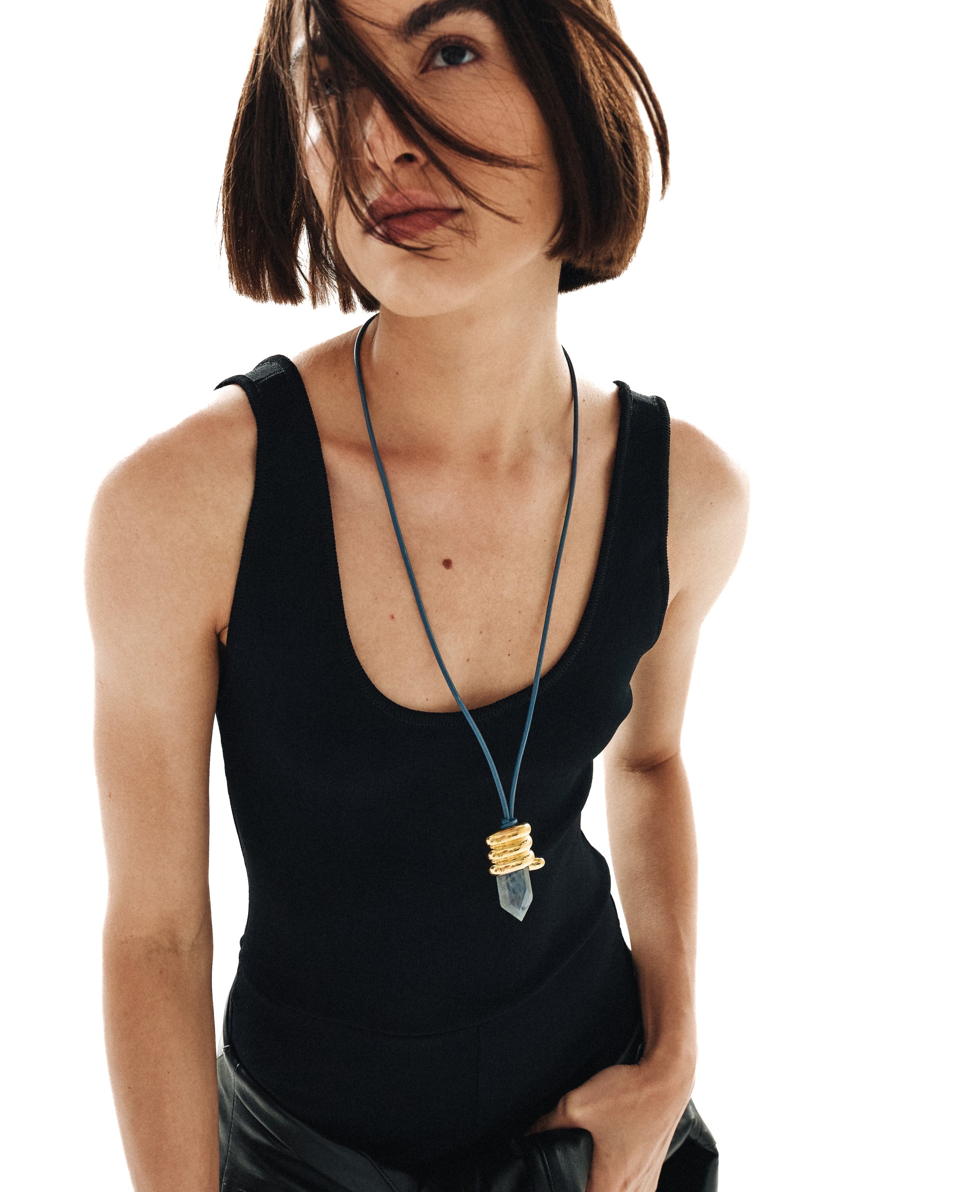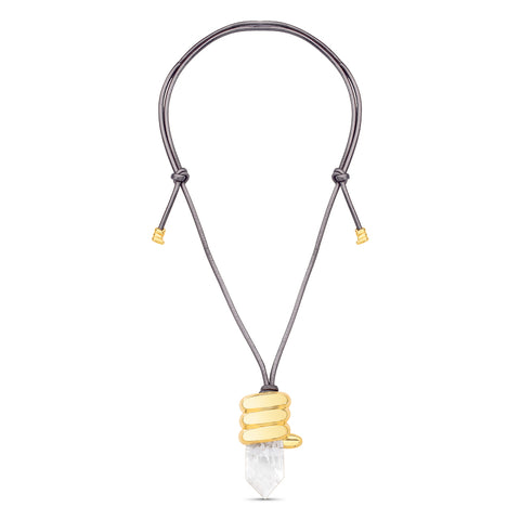 Na parte frontal, o destaque fica por conta do pingente com pedra natural, lapidada em formato prismático, que reflete a luz de maneira sutil e cria variações de brilho conforme o movimento. A pedra é envolvida por uma estrutura metálica escultural, com volumes orgânicos inspirados nos nós em estilo rococó, criando um contraste sofisticado entre transparência, brilho e solidez.